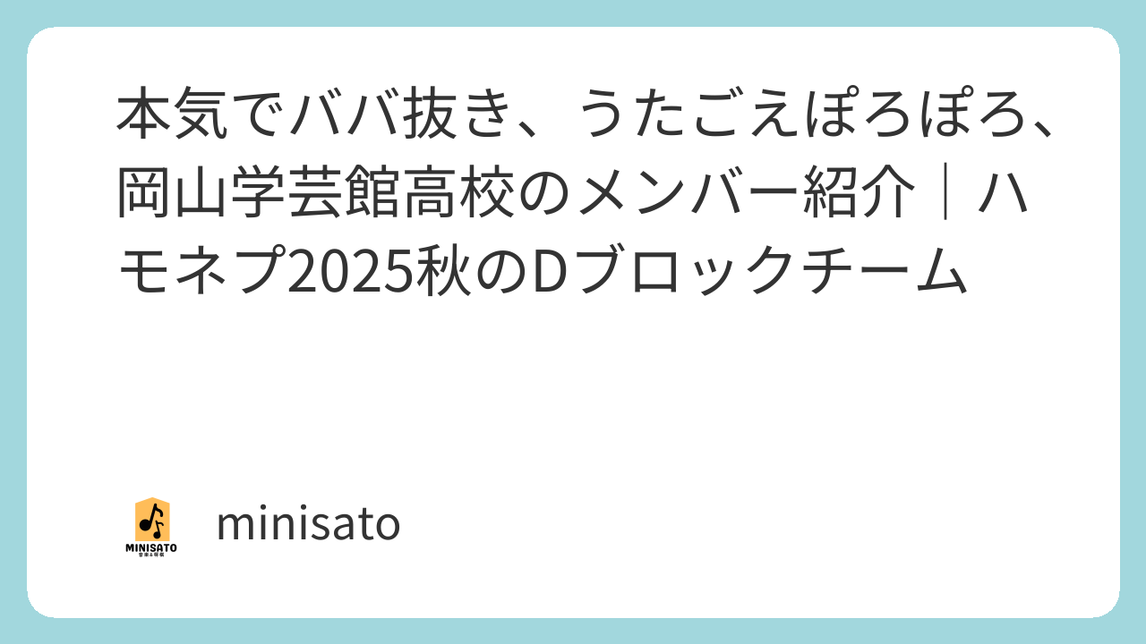 本記事では11月15日に迫った全国ハモネプ大リーグ2025秋(第31回)に関連し、Dブロック出場の3チーム(本気でババ抜き、うたごえぽろぽろ、岡山学芸館高校)についてご紹介しました!